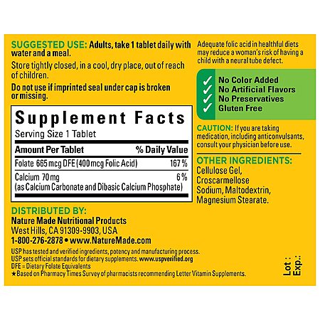 Model: Nature Made Folic Acid 400 mcg (665 mcg DFE), Dietary Supplement for Nervous System Function, 250 Tablets, 250 Day Supply