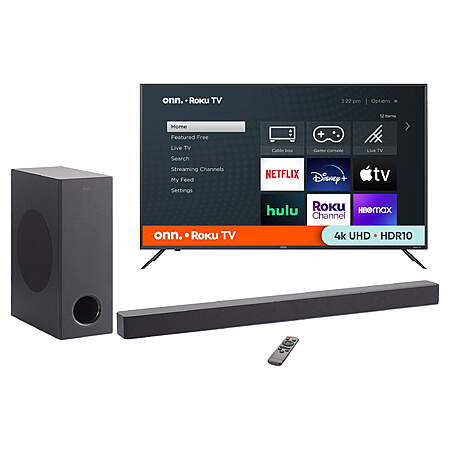 Onn. 50in 4K Roku TV with onn. 37in 3.1 Dolby Atmos Soundbar with Wireless Subwoofer $298