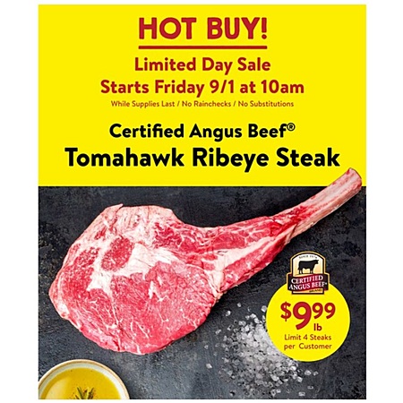 Fresh Thyme [freshthyme.com] has Certified Angus Beef Tomahawk Ribeye Steak $9.99 / lb.