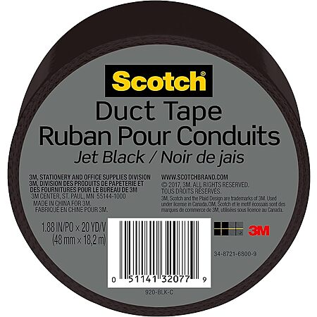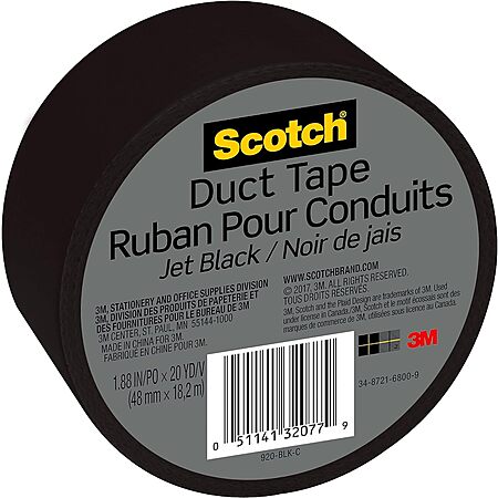 Amazon has 1.88" x 20yd Scotch Duct Tape (Jet Black, 920-BLK-C) on sale for $1.96. Shipping is free w/ Prime or on $25+ or $35+ orders (minimum requirement varies by location).
