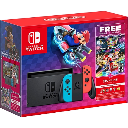 This bundle has a Nintendo Switch system with Neon Red and Neon Blue Joy-Con controllers. Plus, enjoy an added $68 value with a download code for the full Mario Kart 8 Deluxe game and a 3-month Nintendo Switch Online Individual Membership