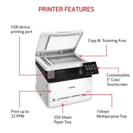 Canon Color imageCLASS MF652Cw - Multifunction Wireless Color Laser Printer. Designed for samll and medium-size businesses the imageCLASS MG652Cw model balances speedy performance and minimal maintenance. A 5 color touchscreen delivers an intuitive user experience.