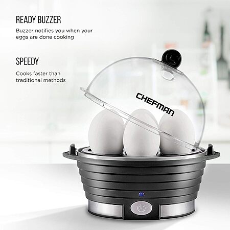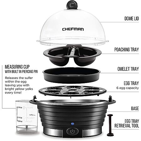 Chefman Egg-Maker Rapid Poacher, Food & Vegetable Steamer, Quickly Makes Up to 6, Hard, Medium or Soft Boiled, Poaching/Omelet Tray Included, Ready Signal, BPA-Free, BLACK