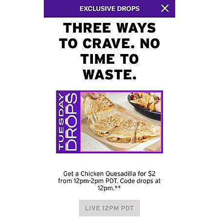 12 PM - 2 PM (PDT) $2 Chicken Quesadilla ——- CODE: 2FOR2QDILLA2309 —- EXPIRED