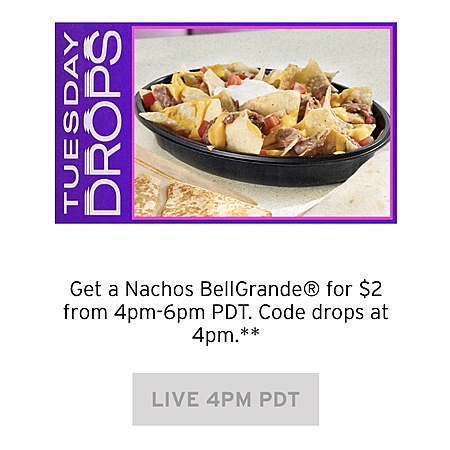 4 PM - 6 PM (PDT) $2 Nachos BellGrande ——- CODE: 2FOR2NBGRND2309 Expired