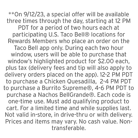 2 PM - 4 PM (PDT) $2 Burrito Supreme ——- CODE: 2FOR2BURSPM2309 —- EXPIRED