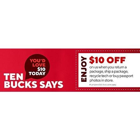 *$10 off on us when you return a package, ship a package, recycle tech or buy passports photos in store. To qualify, customers must either return a package via Amazon Returns, Happy Returns or Express Returns, purchase passport photos, drop off or ship a UPS® package or recycle tech at a Staples® U.S. store location. Not valid on returns of Staples purchases. $10 off $30 offer valid in Staples® U.S. stores only. Not valid on Instacart orders. Limit one coupon per customer, nontransferable. Offer is subject to change or cancellation at any time. Minimum purchase requirement must be met with purchases to which no other coupon or instant savings offer applies. Tax not included in calculating the minimum purchase. Not valid on desktop or laptop computers, PC hardware and accessories, tablets, Chromebooks, streaming devices, Amazon products, Apple® products, Bose® products, operating systems, ink or toner, HP+ and Instant Ink prepaid cards, Epson® EcoTank® printers, Epson ink or toner, HP ink or toner, HP printers, Google™ products, Samsung® products, Staples® Protection & Tech Help, gaming consoles and accessories, Texas Instruments™ graphing calculators and accessories, mobile phones, gift cards, phone cards, postage stamps, iPostal1 services, computer workstation rental, home automation devices, TVs, select commercial kitchen appliances and accessories, software, warranties, wearable technology, Staples® Plus membership fee, select hard drives and data storage devices, surveillance and security cameras, Ultimate Ears® products, Wacom® products, Cricut® machines, direct mail services, faxing, custom-quoted orders, promotional products, scanning, self-service printing, passport photos, passport expedition, TSA PreCheck® enrollment services, PRO services, podcasting, Staples Studio or virtual notary services. Each item purchased can only be discounted by one coupon, applied by cashier. Coupon not valid if purchased or sold and must be surrendered. Not valid on prior purchases or purchases made with Staples Advantage In-store Purchase Program. No cash/credit back. Coupon value applied pre-tax.