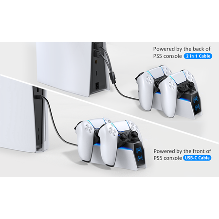 - Designed to charge two PS5 controllers simultaneously, powered directly from the PS5 Disk/Digital console via 1 of the included PS5 charging cables.