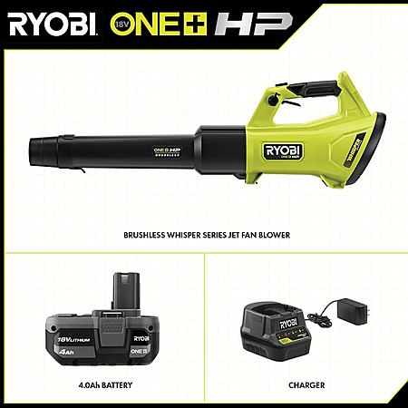 Model: RYOBI ONE+ HP 18V Brushless Whisper Series 130 MPH 450 CFM Cordless Battery Leaf Blower with 4.0 Ah Battery and Charger