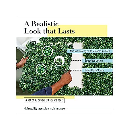 - FULL COVERAGE: Our artificial grass panels set consists of 12 boxwood panels, covering up to 33 square feet. With 4-5 layers of leaves, the decorative privacy fence provides ideal screens for your happy, private space