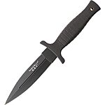 This isn't really a practical EDC or work knife, but if you have a need/want for an inexpensive dagger/boot knife like this then it is a good price for it. It will open boxes with the best of them, and 7Cr17MoV stainless steel is fairly tough and durable for a budget steel. Won't hold an edge for long if used a bunch, but will be easy to resharpen. The leather sheath with a retention snap and belt/pocket clip is a nice touch. 4.7" of double edge blade is nothing to sneeze at, likely illegal in many places (especially if concealed), and hard to convince a cop that you are carrying a knife like this for work.