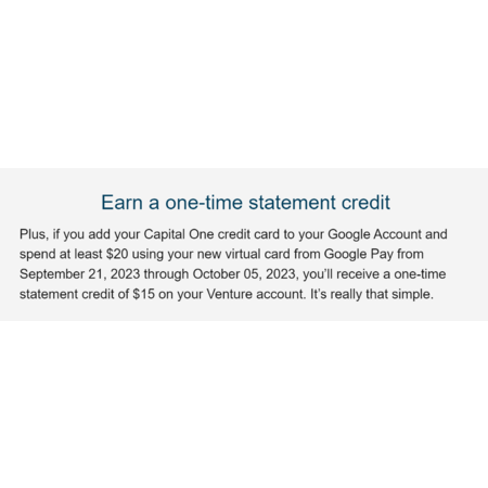 Plus, if you add your Capital One credit card to your Google Account and spend at least $20 using your new virtual card from Google Pay from September 21, 2023 through October 05, 2023, you'll receive a one-time statement credit of $15 on your Venture account. It's really that simple.