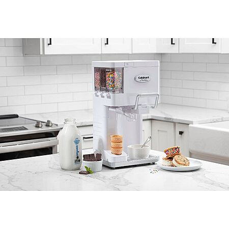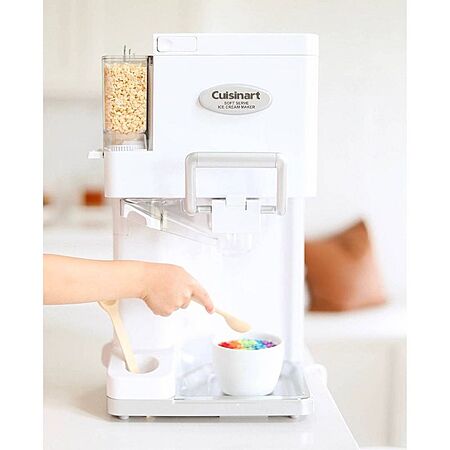 Professional-quality soft ice cream, yogurt, sorbet and sherbet is now available right at home, with the Cuisinart® Mix It In™ Soft Serve Ice Cream Maker. Not only does it make everyone's favorites, but with three built-in condiment dispensers, it makes them extra delicious! Just a pull of a tab sends sprinkles, chips and other mix-ins down the chute to mix right into frozen desserts as cones or bowls are filled. Operation is fully automatic; simply pour in the ingredients and turn the dial.