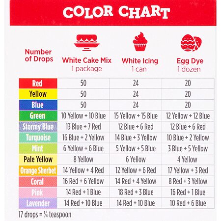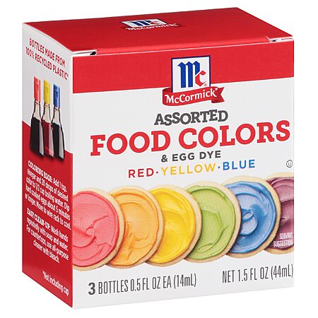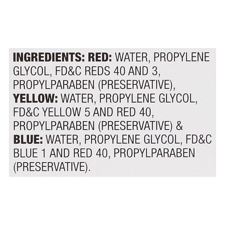 - Contains 0.5 fl oz bottles of red food color, yellow food color and blue food color