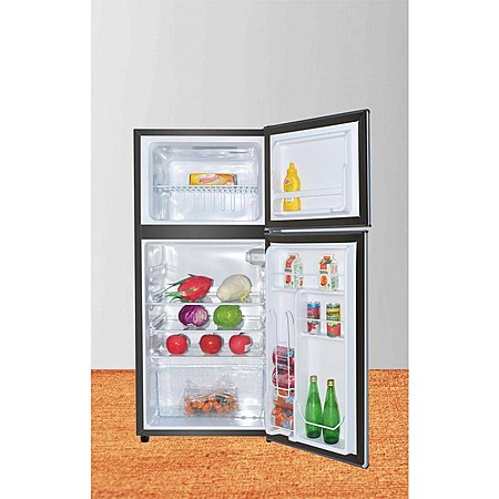 Keep your drinks cold and your perishables fresh with the RCA compact refrigerator. It's roomy enough for your groceries, snacks and beverages yet small enough to fit almost anywhere, even in places where space is a premium. An invisible door handle and adjustable legs add to the functional design of this sleek 2-door refrigerator and freezer. Features include a built-in door can holder, built-in tall bottle holder and slide out shelves for even extra room. This freestanding compact refrigerator is the perfect dorm fridge for college students. It also works well in offices, basements, warehouses, rec rooms, man and woman caves and more. Color: Stainless Steel.