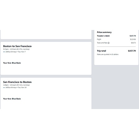JetBlue and United Airlinehave round trip airfares travelling to and from San Francisco (SFO) and Boston (BOS) for $158, nonstop. These are basic economy fares, a restricted-type fare. On both JetBlue and United, you're only allowed a personal item. There is no seat selection, no carry-on bag and no change. If you are travelling with children, you will be seated together as per United's policy.