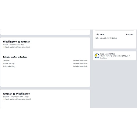 Saudia Airlines via Travelocity have round trip airfares travelling from Washington DC (IAD) to Amman Jordan (AMM) for $747, making 1 stop, both ways. These are economy basic fares that include a personal item, a carry-on bag and 2 free checked bags. There's no seat selection and no change without incurring extra fee(s).