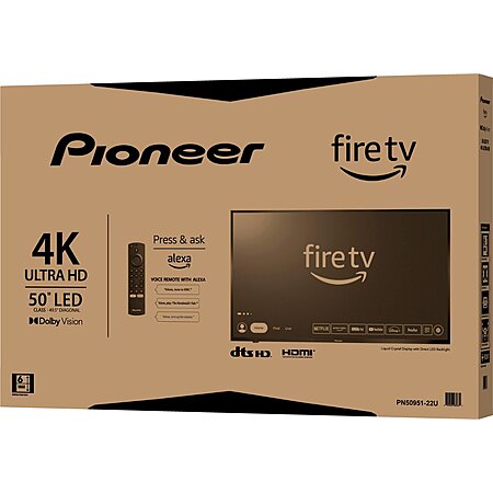 Prepare yourself for an experience that will change the way you view entertainment. The Pioneer PN50951-22U 50" Class LED 4K UHD Smart Fire TV is equipped with 4K Ultra HD and High Dynamic Range, delivering stunning results that enhance your favorite TV shows, movies, sports and more. Dolby Vision boosts your viewing experience by delivering improved picture quality with detailed images. An LED-backlit LCD screen surpasses your expectations for an enjoyable movie night. Access live over-the-air channels and streaming—and control it all with your voice. Ask Alexa to launch apps, search for titles and more. Made for the ultimate entertainment experience, versatile connection options give you the ability to upgrade your home theater to the best of its potential. Gift yourself better entertainment by entering the world of Pioneer TVs.