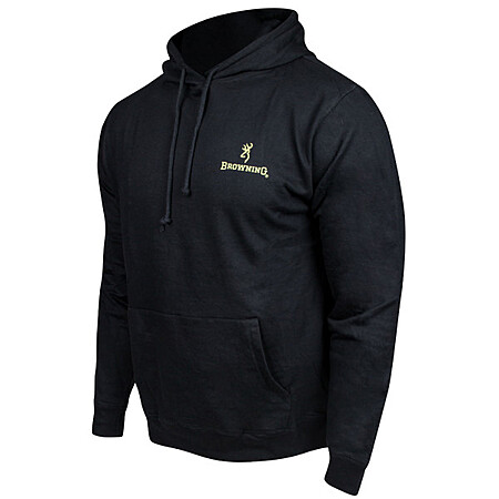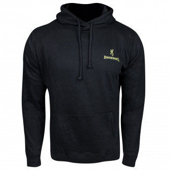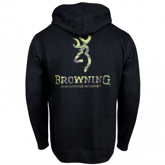 small logo on the chest; big logo (camo'd) on the back. Sweater itself is plain black.
