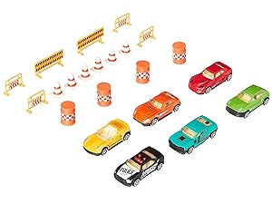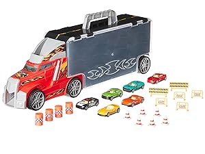 Model: Amazon Basics Toy Car Carrier Truck With Storage For Kids Ages 3 and Up, 6-Pieces Diecast Vehicles & 16 Accessories, Multicolor