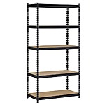 The Edsal UR185P-BLK 5-shelf freestanding shelf unit has shelves made of particle board to support an 800 lb. per shelf capacity and a 4000 lb. total capacity when the weight is distributed evenly across all shelves. This unit has double-riveted beams that lock into double-rivet holes on the corner post for structural security. The corner post rivet holes on this unit are punched at 1-1/2 in. intervals for precise adjustment to desired shelf height. The steel rack has a black powder coat finish to resist corrosion. This unit is open on all 4 sides to facilitate access to shelf contents from any angle. The posts on this unit have a 2-piece design so it can be assembled vertically to create one 72 in. H x 36 in. W x 18 in. D unit or assembled horizontally to create two 36 in. x 36 in. x 18 in. units, 1 unit with 2 shelves and 1 unit with 3 shelves. (H is height, the vertical distance from lowest to highest point; W is width, the horizontal distance from left to right; D is depth, the horizontal distance from front to back.) This shelf unit has a rivet lock design for boltless assembly. Assembly instructions are included. A rubber mallet (sold separately) is recommended for assembly.