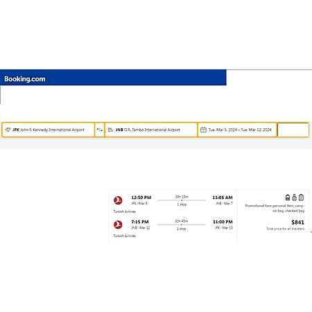 Turkish Airlines via Booking.com have round trip airfares travelling from New York (JFK) to Johannesburg South Africa (JNB) for $841, making 1 stop in Istanbul both ways. Stopover in Instanbul will be about 9 hours so plan ahead. This airfare includes a personal item, a carry-on bag and 2 free checked bags. There is no seat selection and no change.