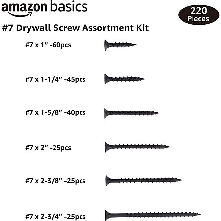 Amazon[amazon.com] has for Prime Members: 220-Piece Amazon Basics Coarse Thread Drywall Screw Assortment Kit (Steel Phillips-Head) for $6.36. Shipping is free.