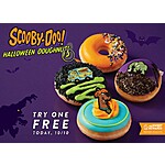 Free Scooby-Doo Halloween Collection Doughnut with any purchase valid 10/10/2023 only at participating U.S. Krispy Kreme shops and is subject to product availability. Qualifying items include Scooby Dooby-Doo Doughnut, Mystery Machine Doughnut, Spooky Monster Cookies n' KREME, Jinkies! Halloween Orange Sprinkle Doughnut, and Chocolate Iced with Halloween Sprinkles Doughnut. Must be a Krispy Kreme Rewards Member to redeem. Limit 1 redemption per customer. In shop, scan barcode in Rewards app or provide account phone number. Online, must log into account and promo code required. Not valid for delivery. Not valid in Times Square. Not valid in Puerto Rico. Offer is not combinable with any other offer, discount or coupon. Upcharge or exclusions for each specialty doughnut, specialty dozen, specialty glaze doughnut, cinnamon roll and/or apple fritter may apply. Void where prohibited. Not redeemable at grocery, convenience, or non-Krispy Kreme shops. No cash or credit back. Sales tax may apply and is extra.