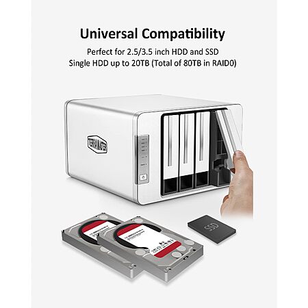Storage: Four 3.5-inch Hard drives up to 80TB (20TB x4), or 2.5-inch hard drives/SSDs, 2 x M.2 NVMe PCIe 3.0 drives.