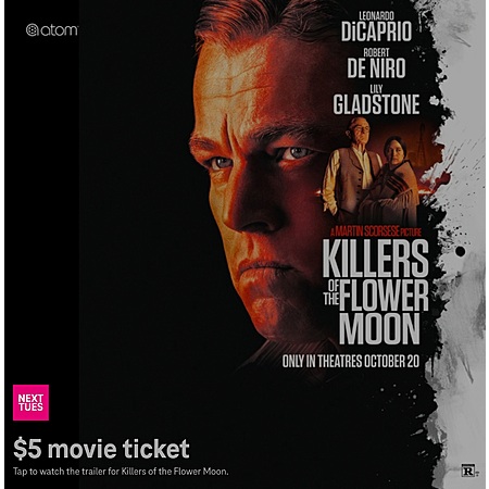 Check back next week to redeem a $5 movie ticket through Atom Tickets to see Killers of the Flower Moon, only in theatres October 20. Follow the FBl investigation of the murder of Osage