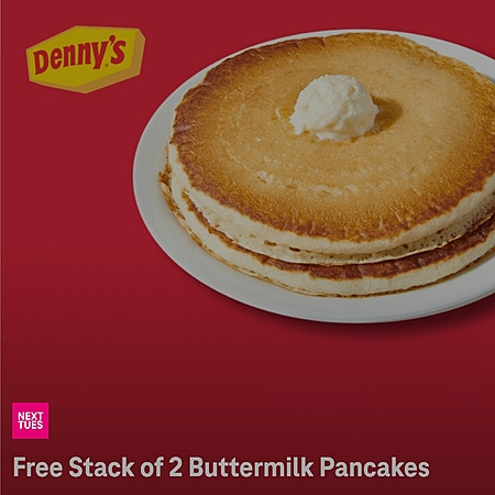Check back next week to score a free stack of two fluffy Buttermilk Pancakes when dining in at Denny's.