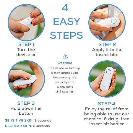 • The Beurer BR60 Insect Bite Healer dissolves saliva, venom and other irritants under the skin by use of a quick-warming ceramic hot plate. This allows the body to stop producing the reaction that causes itching and swelling. There are two different programs to use depending on skin type (sensitive or regular). For best results, use immediately after insect bites.
