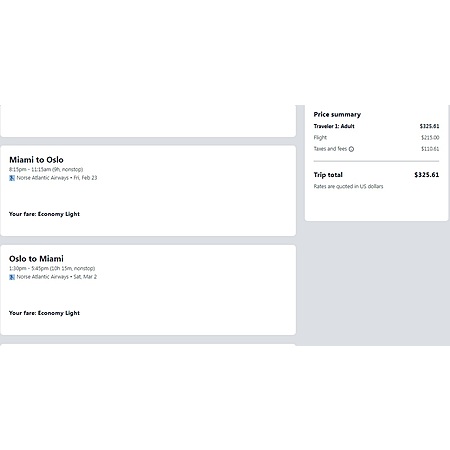 Norse Atlantic Airways, a low-cost, long-haul airline based in Norway have round trip airfares travelling from Miami (MIA) to Oslo Norway (OSL) for $326, nonstop. This is a low-cost airline so your low airfare is a basic economy which only include a personal item. There is no carry-on bag, no seat selection and no change. You will have options to pay for additional services.