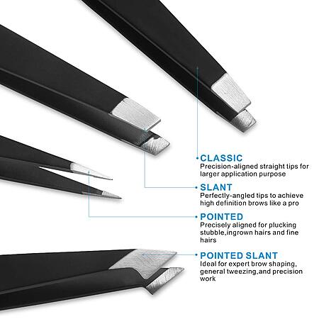 • 4 in 1 Set, This set contains a pair of classic, slant, pointed, and pointed slant tweezers. Perfect choice to handle a variety of jobs