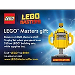 LEGO Masters Offer via Walmart is offering LEGO Masters Mini Trophy Building Set for Free w/ Purchase of $50+ of Qualifying LEGO Building Sets sold/shipped by Walmart or when you follow the instructions listed below. Shipping is free (if purchasing online at Walmart)