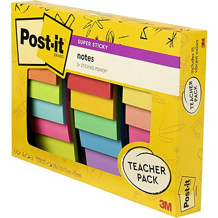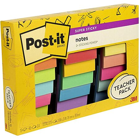 Amazon[amazon.com] has Post-it Super Sticky Notes Teacher Pack (15 Pads/Pack, 45 Sheets/Pad) for $10.80. Shipping is free w/ Amazon Prime or on orders $25+.