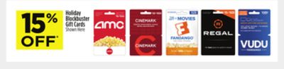 Thru October 28th, save 15% on the following Holiday Blockbuster gift cards In-Store Purchase only.