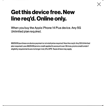 New Verizon Customers: 4 Lines Unlimited 5G from $120/Month w/ Auto Pay + 4-Count iPhone 14 Plus 128GB Phones Free After 36-Monthly Bill Credits when you follow instructions below: