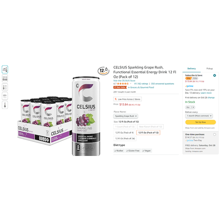 CELSIUS Sparkling Grape Rush Energy Drink 12 Fl Oz (Pack of 12) $13.84 w/ S&S