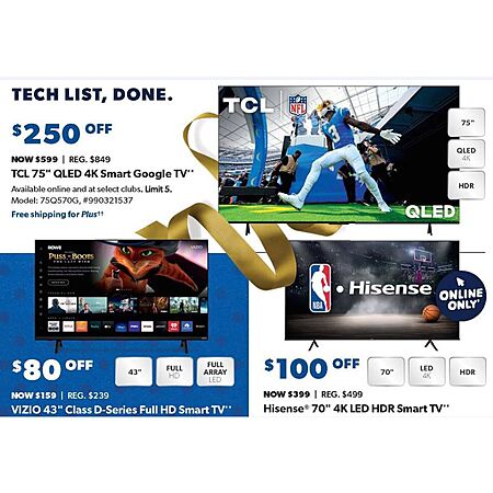 Beginning November 3, Sam's Club will have selet TVs on sale. Shipping is free for PLUS members.