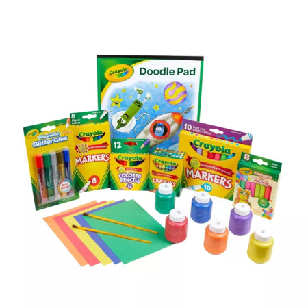 The Crayola Super Art & Craft Kit comes with over 100 pieces. Let kids bring their imagination to life with an art set that includes a Reusable Storage Container, Broad Line Markers, Washable Kids Paint, Short Colored Pencils, Washable Glitter Glue, Modeling Clay Sticks, Doodle Pad, Mini Construction Paper, Paint Brushes, Fine Line Markers, and Crayons. These standard counts of Crayola art supplies fit neatly in the storage tub—with extra room for creations and additional art tools with this art set at their fingertips, kids can make all kinds of colorful creations Ideal for ages 6 and up.