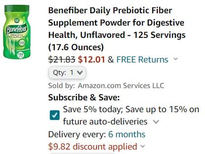 Benefiber Daily Prebiotic Fiber Supplement Powder for Digestive Health, Unflavored - 125 Servings (17.6 Ounces) $12.01