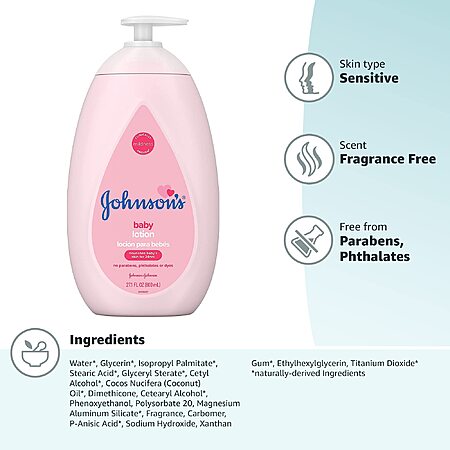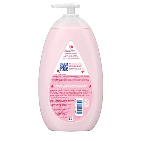 Product Description from Store- 27.1-fluid ounces of Johnson's Mild Baby Moisturizing Pink Lotion with coconut oil hydrates and nourishes your little one's skin and moisturizes to help maintain baby's healthy-looking skin