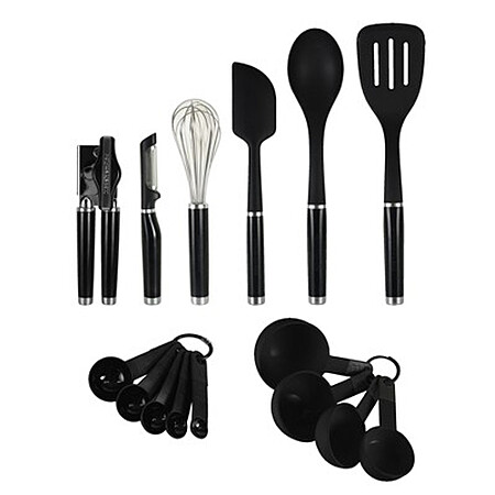 Includes: slotted turner, basting spoon, scraper spatula, euro peeler, utility whisk, can opener, set of 4 measuring cups, and set 5 measuring spoons.