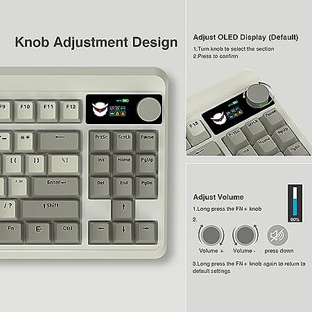 • Built-in smart OLED color display can display the keyboard status, including custom gif image, caps lock, connection mode, WIN/MAC, battery