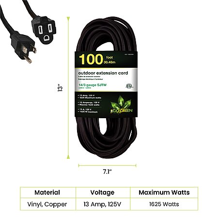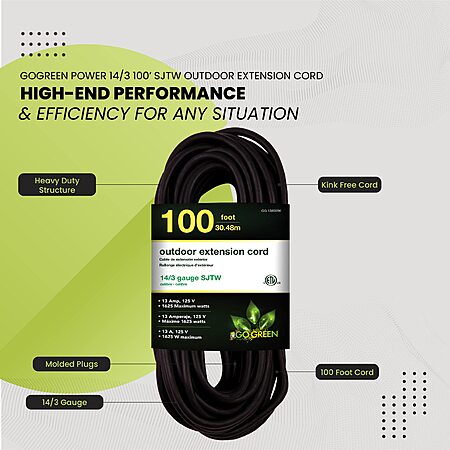 - GoGreen Power (GG-13800BK) is a contractor grade 100 feet long 14/3 SJTW extension cord