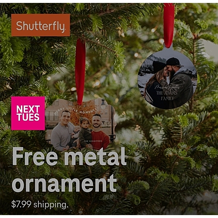 Get holiday-ready with a free metal ornament from Shutterfly. $7.99 shipping additional.