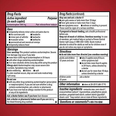 ACTIVE INGREDIENT: This pain relief medication contains acetaminophen 500 mg, a pain reliever/fever reducer which compares to the active ingredient of Extra Strength Tylenol Caplets