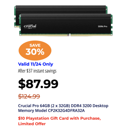 64GB (2x 32GB) Crucial Pro DDR4 3200 Desktop Memory + $10 PlayStation Gift Card