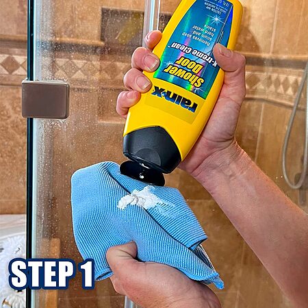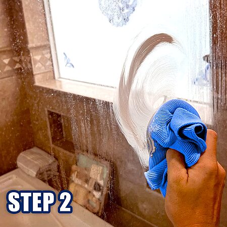 - Directions - Using A Damp Soft Cloth Or Apply Directly On The Glass Shower Door Then Apply Pressure And Rub Onto Surface In A Circular Motion; Finally Rinse And Wipe Dry With A Paper Towel Or Cloth